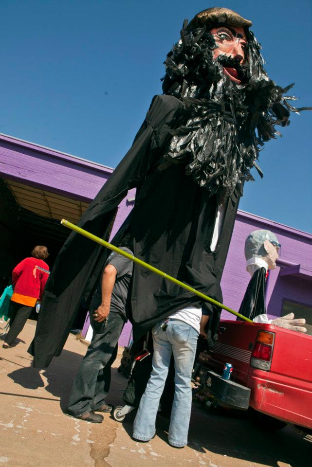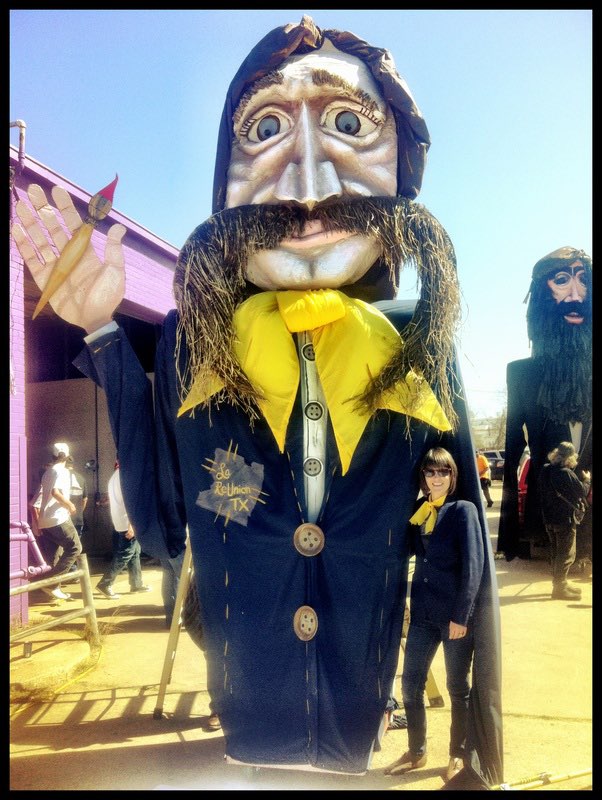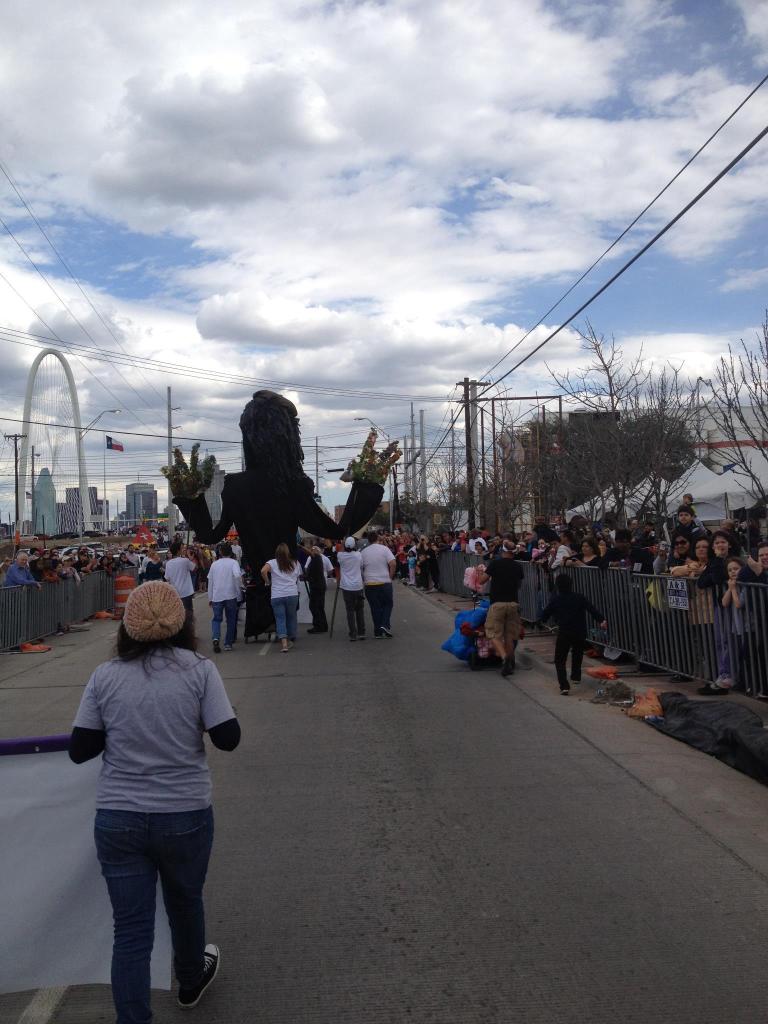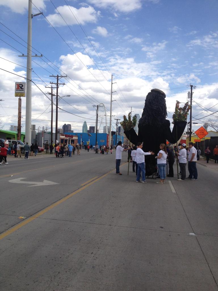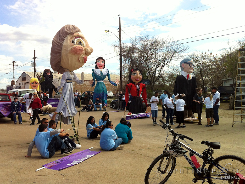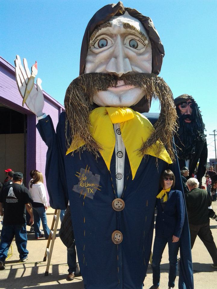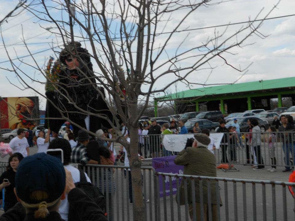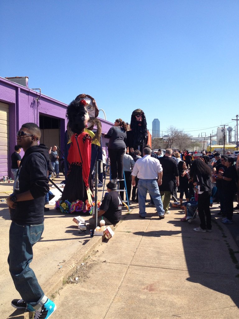 The final preparations for the Parade of Giants began on the morning of March 3rd, 2012. Kevin Obregon and the Friends of Reverchon Park joined the other teams and their giants just outside the construction warehouse. Here, they held interviews with various news teams and prepared to roll out the giants onto the main road. Many of the photos taken during this prep stage are the only known photos of the Julien Reverchon Giant in full, natural sunlight.