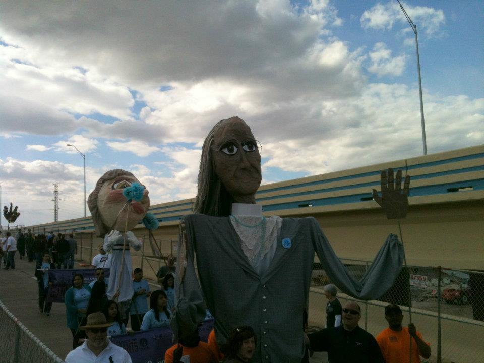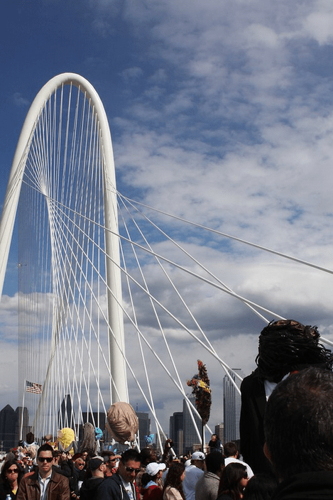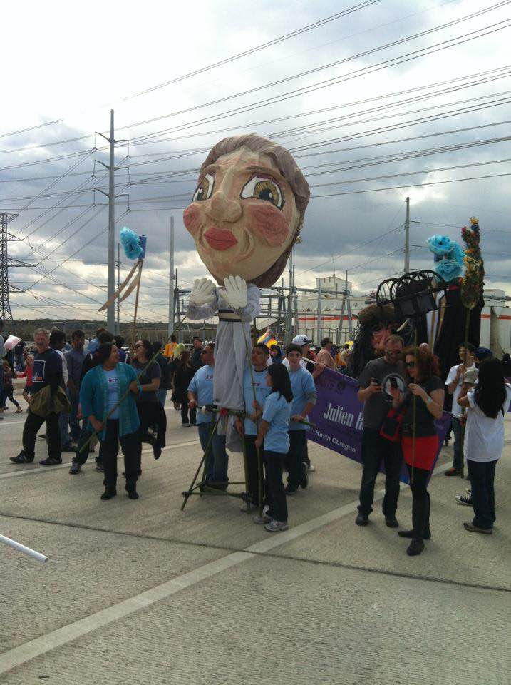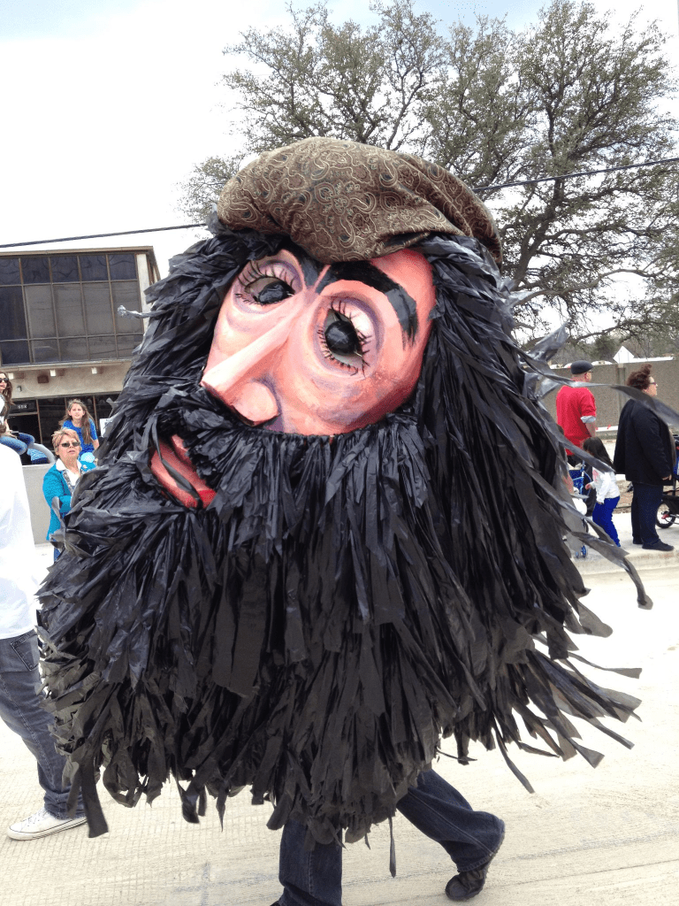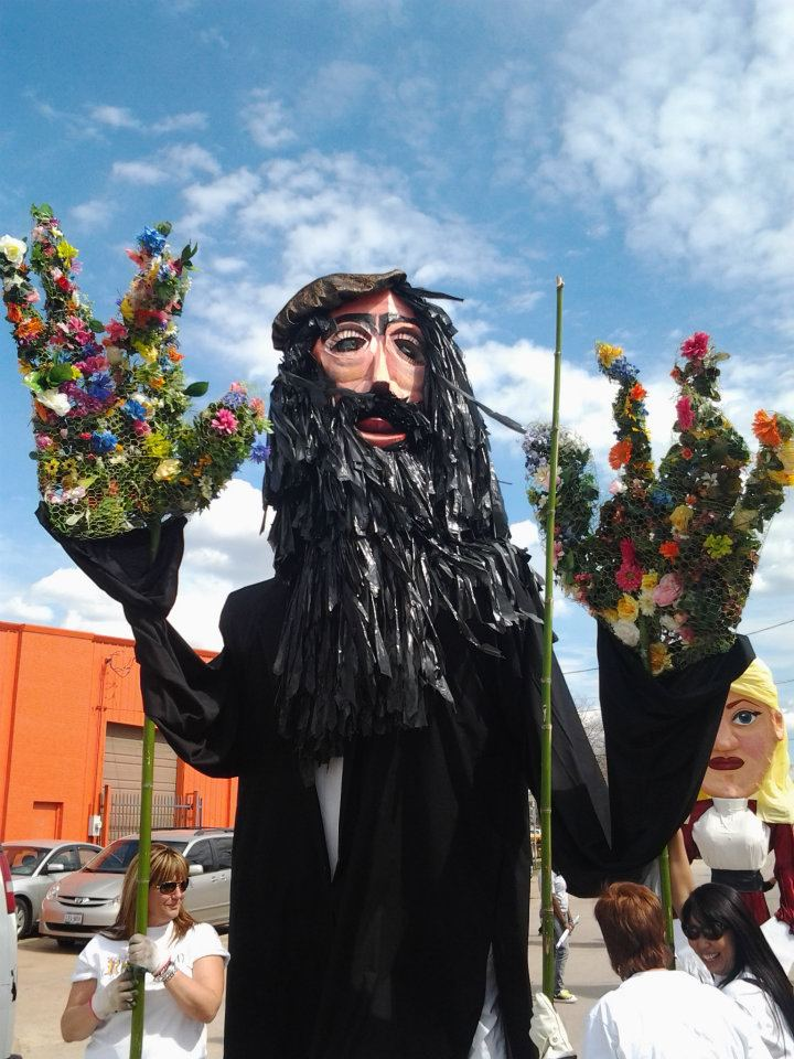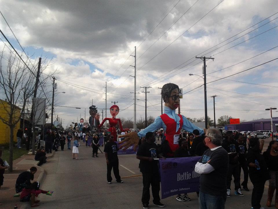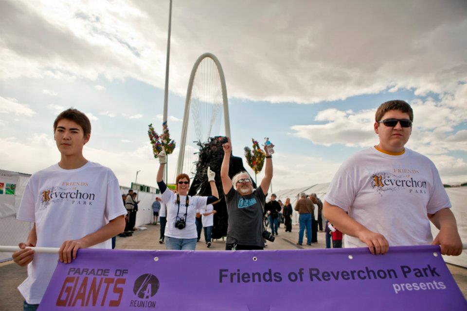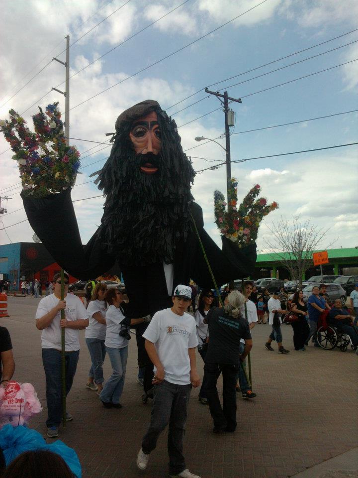 The final preparations for the Parade of Giants began on the morning of March 3rd, 2012. Kevin Obregon and the Friends of Reverchon Park joined the other teams and their giants just outside the construction warehouse. Here, they held interviews with various news teams and prepared to roll out the giants onto the main road. Many of the photos taken during this prep stage are the only known photos of the Julien Reverchon Giant in full, natural sunlight.